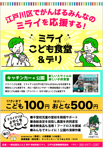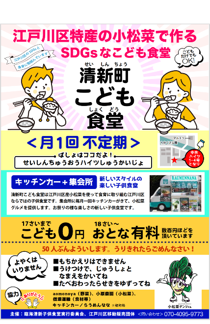 清新町こども食堂(毎月開催)キッチンカー+集会所で行う新しい形の子供食堂。江戸川区産の小松菜を使用したメニューでの提供、食育と江戸川区のSDGs10番に取り組んでいます。